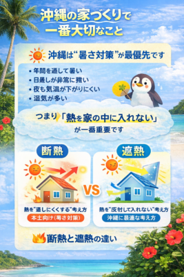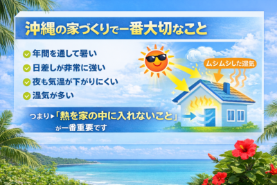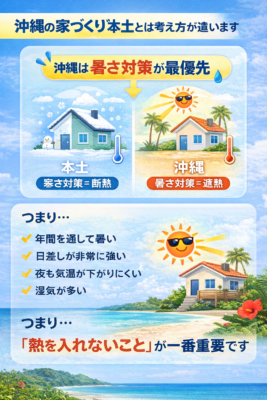 本土の住宅は「寒さ対策=断熱」が中心ですが、沖縄では少し違います。